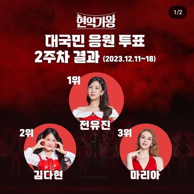 현역가왕이 4회까지 방송되었고 대국민 투표를 시작한 지 2주가 지나 2주 차 결과가 발표되었습니다. 현역가왕 시청하시면서 아직도 투표 안 하고 계신 분 있으시다면 지금이라도 현역들을 위해 투표해 주시기 바랍니다. 2024년 한일가왕전 출전이 걸린 국가대표 TOP7이 되기 위해 고군분투하는 현역들에게 투표로 응원해 줍시다. 어렵지도 않고 오래 걸리지도 않아요.