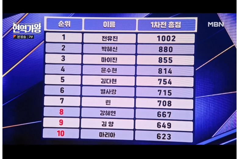 * 현역이름 총점(연예인판정단점수 + 국민판정단 점수)